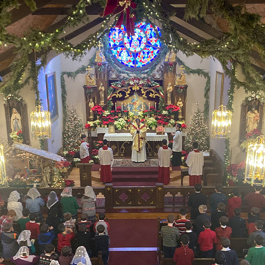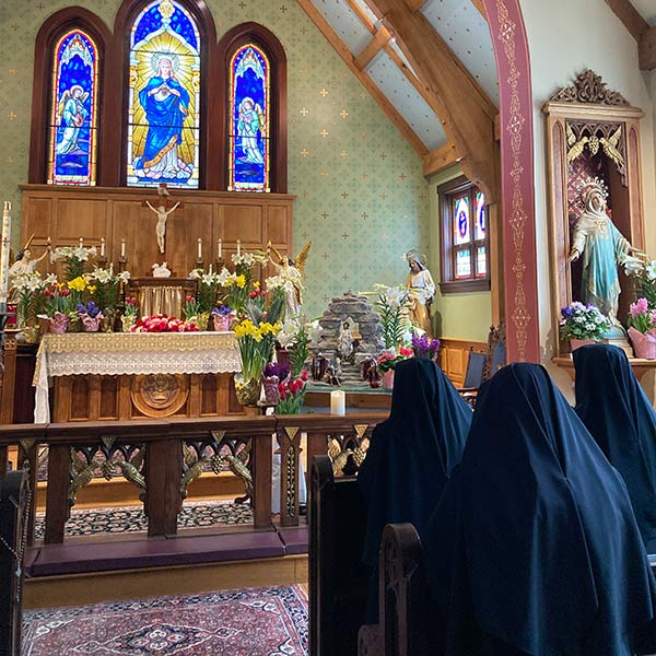 The liturgical ceremonies and feast-days of the Traditional Rite fill the lives of the religious with a richness and ever-present love of Our Lord. The daily recitation of the traditional 15 decades of the Rosary, takes the place of the Hours in our active life. Each day ends with “The Little Office of Our Lady” when Compline is sung in the convent chapel.